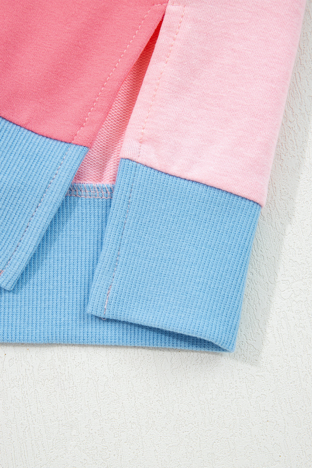 Light Pink Floral Colorblock Patchwork Chest Pocket Notched Neck Long Sleeve Top